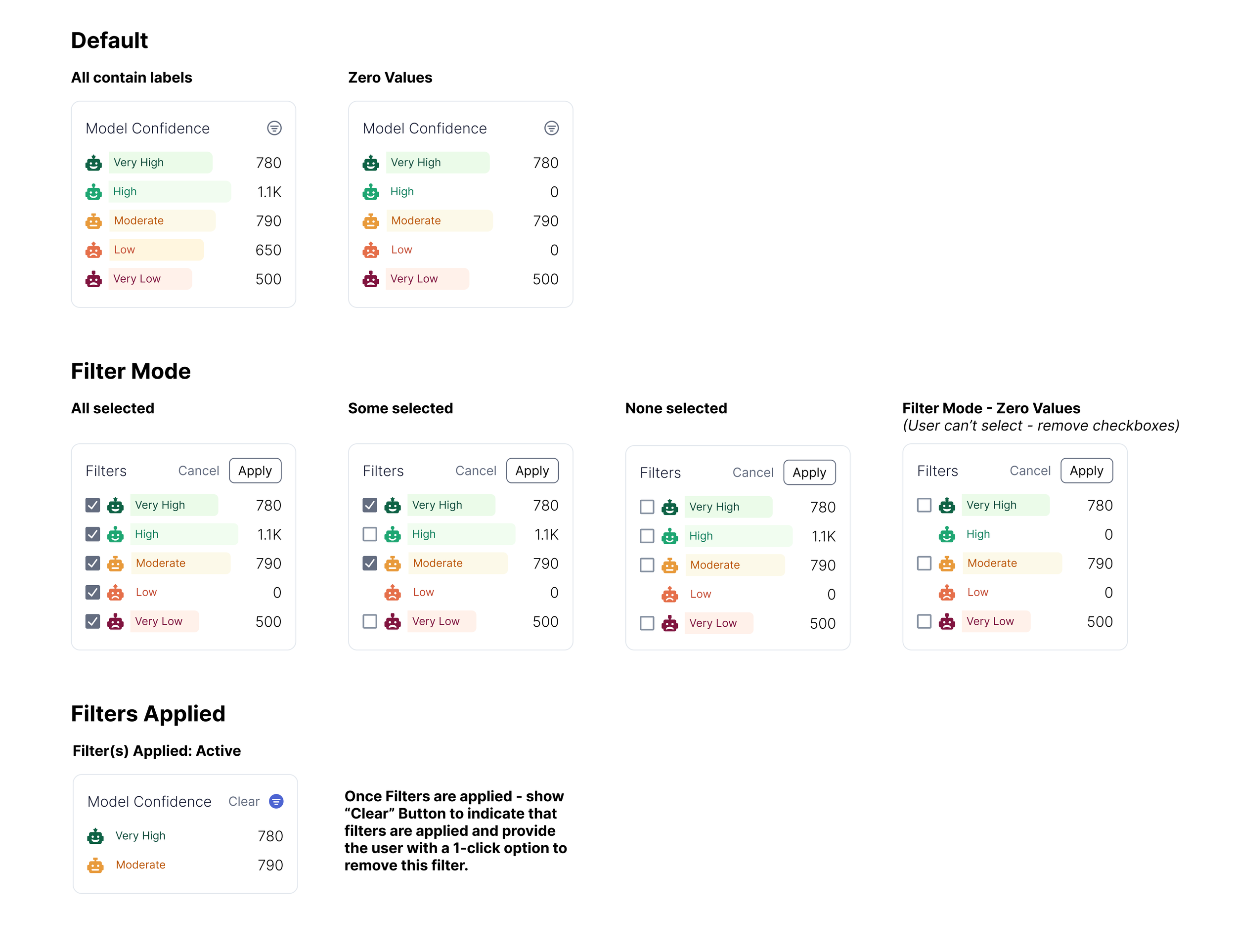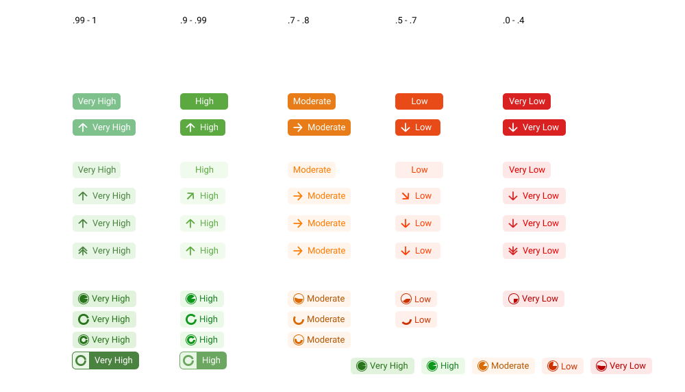 Once I had an accuracy percentage I could asses how to provide meaning to our categories (Very Low, Low, Moderate, High, and Very High). I assigned an accuracy percentage to each of these confidence categories that would resonate with users.