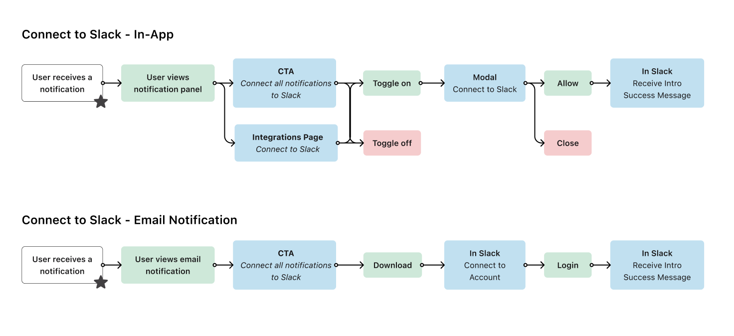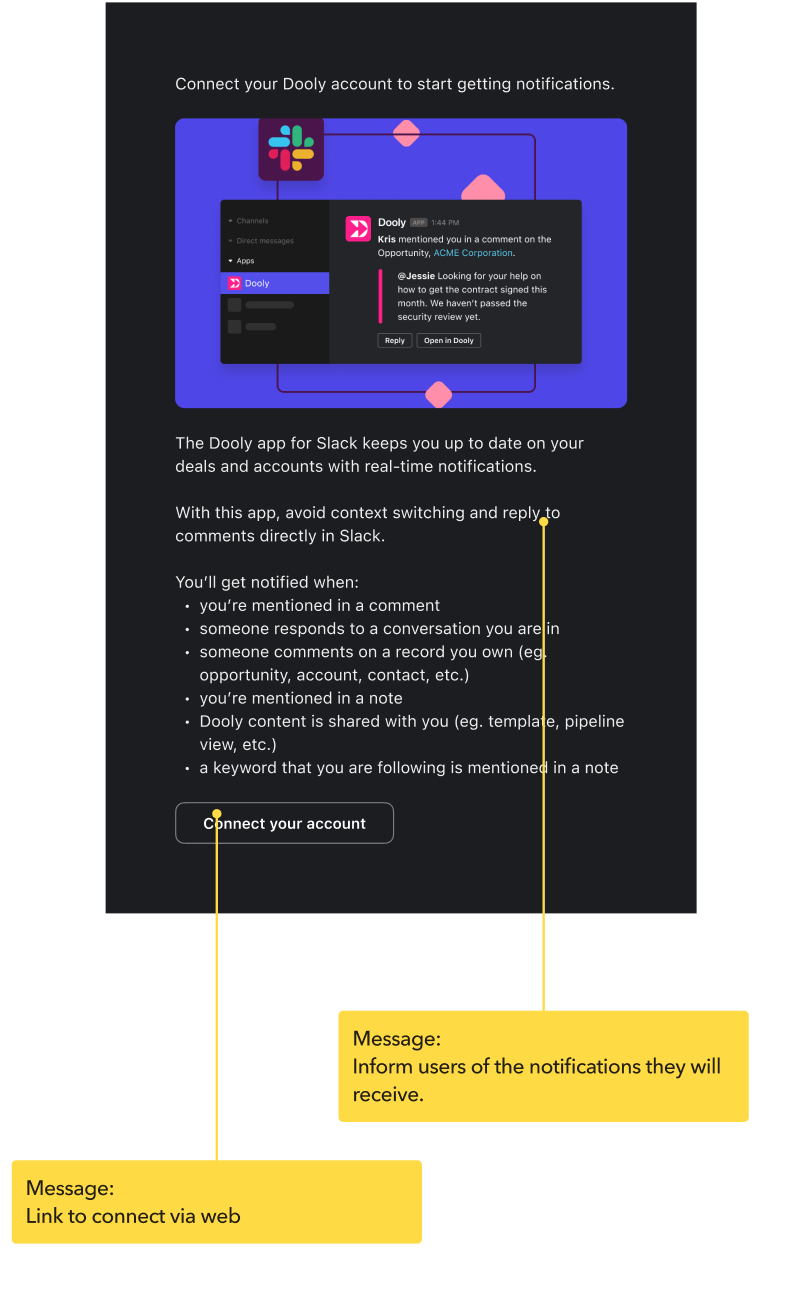We wanted to meet our users while they are experiencing this pain. We created a flow for users to install our Slack integration after they received an in-app or email notification. Our Slack integration included links to the app and the ability to respond to a comment via Slack.