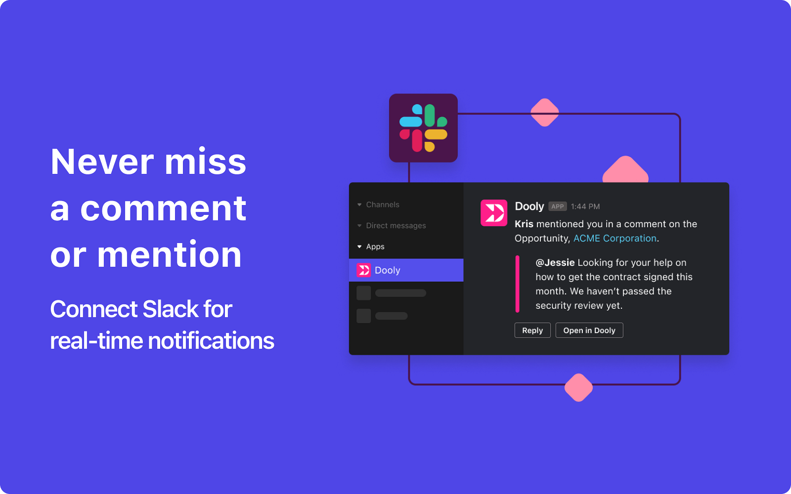 Our Slack integration enabled users to receive and reply to notifications via Slack. Users can also push notifications to custom Slack channels so they and their colleagues never miss a notification. The project started post-launch of our new in-app commenting feature.